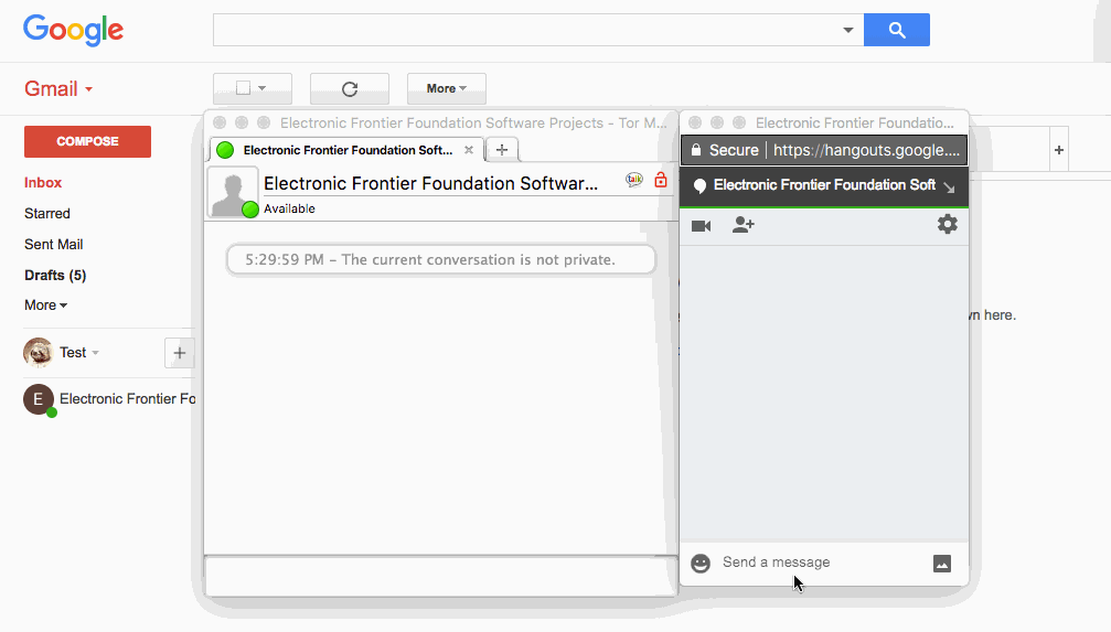 เราได้สร้างภาพเคลื่อนไหวด้านล่างเพื่อสาธิตให้เห็นวิธีการทำงานของการเข้ารหัสจากต้นทางถึงปลายทางและการเข้ารหัสในชั้นการขนส่งสำหรับข้อมูลที่อยู่ระหว่างการส่งผ่าน ทางด้านซ้ายคือเครื่องมือแชทสำหรับการเข้ารหัสจากต้นทางถึงปลายทาง (หน้าต่างแชทที่ใช้ Off-the-Record (ไม่มีการบันทึกข้อมูล) (หรือ “OTR”) โปรโตคอลการส่งข้อความแบบทันทีที่มีการเข้ารหัส) ทางด้านขวาคือหน้าต่างแชทสำหรับการเข้ารหัสในชั้นการขนส่ง (เข้ารหัสผ่านการใช้ HTTPS ในเว็บไซต์ของ Google Hangout)